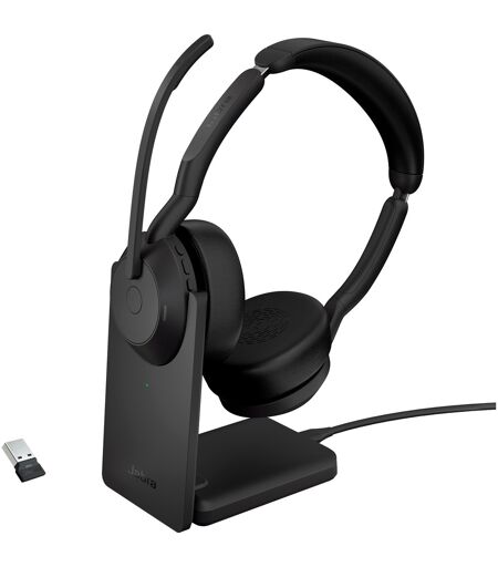 Das Jabra Evolve2 55 ist ein professionelles schnurloses Headset der nächsten Generation mit erstklassigem Sound und außergewöhnlichem Tragekomfort. Es sorgt mit einer aktiven Geräuschunterdrückung (ANC), zwei erstklassigen geräuschunterdrückenden Mikrofonen sowie einem hochmodernen Chipsatz für ein noch klareres Gesprächserlebnis. Per BusyLight LED mit 360-Grad-Sichtbarkeit werden andere Teilnehmer darauf aufmerksam gemacht, wenn man sich in einem Gespräch befindet. Die Stummschaltung lässt sich aktivieren, indem man den Mikrofonarm nach oben dreht. Bewegt man ihn wieder nach unten, wird die Stummschaltung aufgehoben. Das Evolve2 55 überzeugt dank Jabra SafeTone einschließlich PeakStop mit einem herausragenden Klang und schützt den Träger vor zu hohen Geräuschpegeln. Das einzigartige Überkopfbügel-Design mit ultraweichem perforiertem druckminimierendem Schaumstoff und innovativen drehbaren Hörmuscheln mit unvergleichlich weichem Polster stellt sicher, dass man das Headset stundenlang tragen kann ohne ein unangenehmes Drücken festzustellen. Einmal aufgeladen, hält das Evolve2 55 bis zu 16 Stunden (ohne ANC) Gesprächszeit aus und kann mittels Bluetooth-Adapter Link380a an den PC angeschlossen werden. Dank der dualen Konnektivität kann man sich über Bluetooth gleichzeitig mit einem zweiten Gerät (z. B. dem Handy) verbinden. So kann man nahtlos zwischen den Playlists auf dem einen Gerät und Anrufen auf dem anderen Gerät hin- und herwechseln. Da das Evolve2 55 für Google Meet und Zoom zertifiziert ist, steht dem nächsten Team-Meeting nichts mehr im Wege. ...