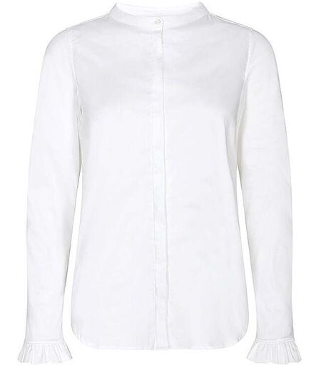 Damen Bluse aus Baumwollmix Enger Rundhalsausschnitt Langarm mit Rüschenabschluss Verdeckte Knopfleiste Gerade geschnitten Unifarben Farbbezeichnung: Weiss Material: 67% Baumwolle, 28% Polyamid, 5% Elasthan ...