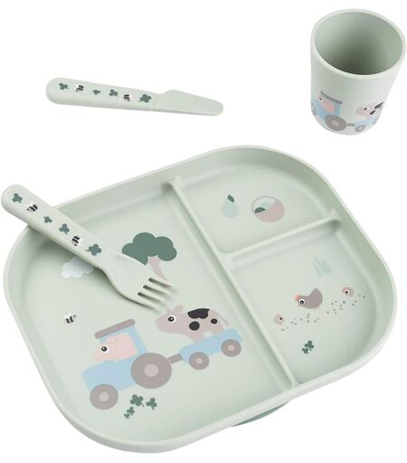 Bringt Spaß an den Esstisch: das vierteilige Foodie Geschirr-Set Tiny Farm von Done by Deer. Es besteht aus einem Teller mit verschiedenen Fächern, einem Becher, einer Gabel und einem Messer. 4-tlg. Foodie Geschirr-Set Tiny Farm von Done by Deer Teller, Becher, Gabel und Messer Teller mit 3 separaten Fächern, hohem Rand und Saugnapf Teller 18(L) x 22(B) x 3 (H) cm, Besteck 12(L) cm, Becher 7(H) x 6,5(D), 135 ml. mikrowellen- und spülmaschinengeeignet Mit dem Geschirr-Set von Done by Deer trainiert Dein Mini das selbstständige Essen. Der Teller des Quartetts macht es dem Kleinen leicht, Speisen mit dem Besteck aufzunehmen. Er verfügt über einen hohen Rand und einen Saugnapf an der Unterseite, der ihn zuverlässig auf dem Tisch hält. Verschiedene Speisen lassen sich dank der unterschiedlichen Fächer getrennt voneinander servieren. Für Getränke steht der 135 Milliliter fassende Becher bereit. Sowohl der Teller als auch der Becher und das Besteck sind optisch aufeinander abgestimmt. Du kannst die einzelnen Bestandteile des Sets sowohl in die Mikrowelle als auch in den Geschirrspüler geben. ...