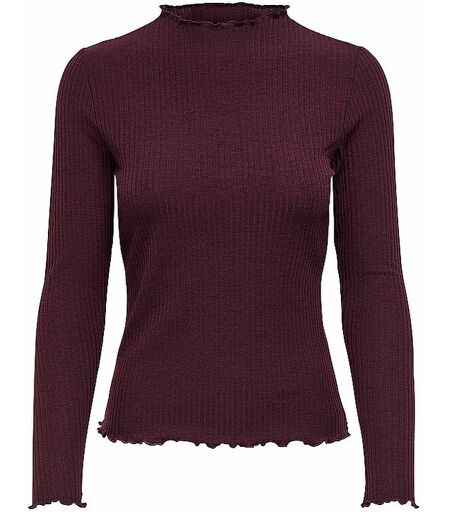 Damen Langarmshirt aus angenehmem Feinstrick Ripp Struktur Schmale Passform Stehkragen Langarm Rüschen an den kanten Farbe: Madder Brown Material: 65% Polyester, 30% Viskose, 5% Elasthan ...