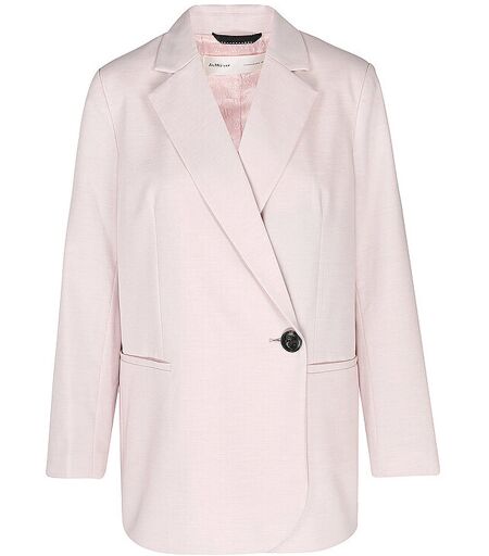 Damen Blazer aus glattem Gewebe mit Woll-Anteil Dazupassende Hose 7552433 Reverskragen Langarm Asymmetrisch angesetzte Knopfleiste Schließt mit einem Knopf Leistentaschen Locker geschnitten Unifarben Farbbezeichnung: Rosa Material: 38% Polyester (Recycelt), 36% Polyester, 17% Viskose, 6% Wolle, 3% Elasthan ...