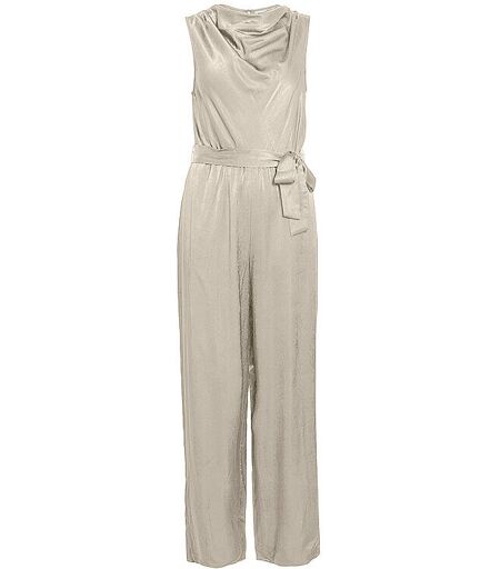 Eleganter Damen Jumpsuit aus Viskose-Mischung Wasserfallausschnitt Ohne Arm Schließt mit Knopf in der hinteren Mitte Bindegürtel in der Taille Weiter Beinverlauf Unifarben Farbbezeichnung: Birch Material: 52% recycelter Polyester, 48% Viskose ...