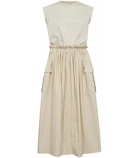 Modisches Damen Midikleid Rundhalsausschnitt Ärmellos Angesetzte Rockpartie mit Falten-Details Aufgesetzte Cargotaschen an den Seiten Midilänge Unifarben Länge: ca: 133 cm. Farbbezeichnung: Ecru Material: 100% Polyamid ...