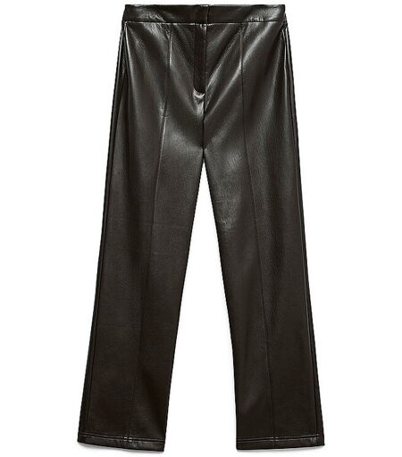 Damen Hose in Lederoptik Mittlere Leibhöhe Elastischer Bund Schließt mit zwei Haken und Reißverschluss Eingrifftaschen am Gesäß Gerader Beinverlauf Unifarben Farbbezeichnung: Chocolate Torte Material: 100% recycelter Polyester ...