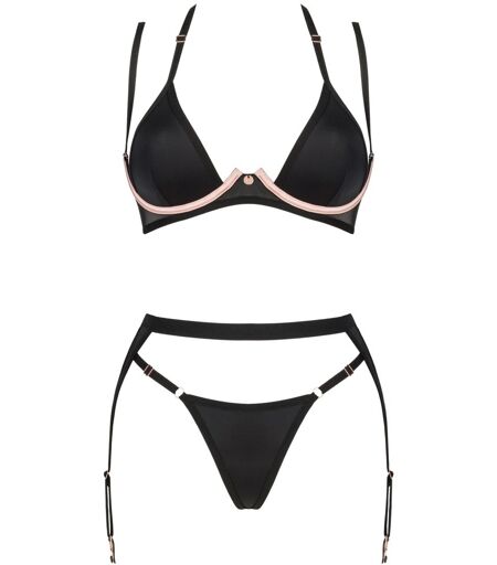 Elegantes 3-teiliges Dessous-Set Selinne von Obsessive bestehend aus Bügel-BH, Strapsgurt und String. Schwarzer Material-Mix aus weichem Stretch-Feinnetz und softer Mikrofaser. BH mit Cup-Bügeln in Kontrastfarbe Rosa. Der Hakenverschluss im Rücken sowie Neckholder und Träger sind für perfekte Passform verstellbar. Der Strapsgurt hat ebenfalls einen Hakenverschluss im Rücken und jeweils seitlich einen Clip-Strumpfhalter. BH und String 85% Polyamid, 15% Elasthan Strapsgurt 94% Polyamid, 6% Elasthan. Lieferung ohne Strümpfe. Achtung - Obsessive hat eine separate Größentabelle. ...