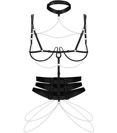 Stilvoll gewagter Harness Premisis von Obsessive Premium im einzigartigen Design mit hochwertigen Materialien und handgefertigt veredelt. Der schwarze Einteiler besteht aus einem Choker, einem Ouvert-BH und einem 3-Riemen-Taillengurt. Alles ist miteinander verbunden und aufwendig mit silberfarbenen Kettchen verziert. Hoher Tragekomfort dank stylischem, textilummanteltem Unterbrust-Bügel und elastischen Riemen. Choker, Träger sowie Taillen- und Rückenriemen sind für perfekte Passform verstellbar. Im Nacken und im Rücken mit Hakenverschlüssen. 83% Polyamid, 17% Elasthan. Lieferung ohne String und Nippel Cover. Achtung – Obsessive hat eine separate Größentabelle. ...