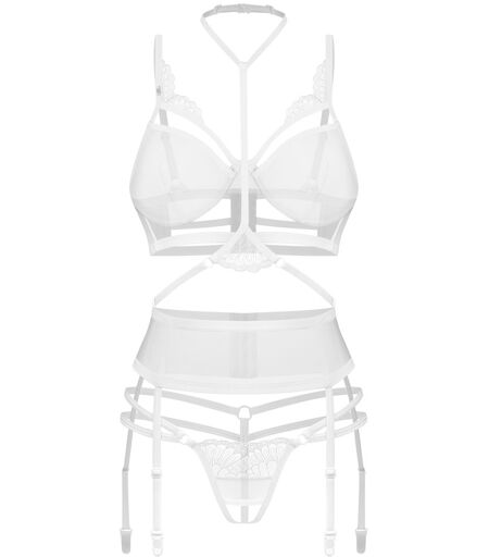 Bügel-BH, Strapsgürtel und Ouvert-String im Set Premisis von Obsessive Premium. Feine weiße Transparenz mit sinnlichen Spitzendetails und dekorativen Stretch-Riemchen. Weich und elastisch für höchsten Tragekomfort. Bügel-BH mit Riemchen über den soften Cups. Im Rücken mit verstellbarem Hakenverschluss. Auch die Träger sind passend verstellbar. Vom Strapsgürtel aus vereinen sich 2 verstellbare Riemen zu einem Brustriemen, der bis zum verstellbaren Choker-Halsband (mit Hakenverschluss) führt. Auch der Strapsgürtel ist im Rücken mit einem Hakenverschluss ausgestattet. Die Strumpfhalter sind ebenfalls passend verstellbar. Der kleine Spitzen-String im Riemen-Styling mit Ringen verführt mit aufregend offenem Schritt. 94% Polyamid, 6% Elasthan 100% Polyester 100% Polyamid. Lieferung ohne Strümpfe. Achtung – Obsessive hat eine separate Größentabelle. ...