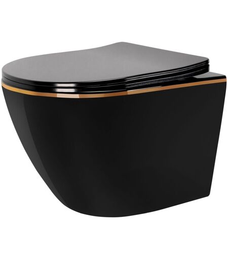 Montageart: Wandhängend Spülsystem: Rimless (randlos) Farbe: Schwarz, Schwarz/Gold Oberfläche: Glänzend Material: Sanitärkeramik Länge: 490 mm Breite: 370 mm Höhe: 370 mm Mit WC-Sitz: Ja, schwarz ...