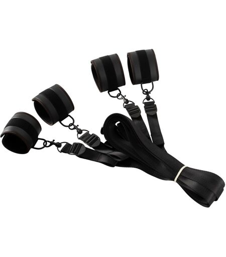 Mit diesem Bettfessel-Set lässt sich jedes Bett in einen profimäßigen Bondage-Playground verwandeln. Das Kreuz aus verstellbaren, reißfesten Riemen passt unter jede Matratze. An den jeweils vier Karabinerhaken der Riemen werden dann die Fesseln für Hände und Füße eingehakt. Die bequemen Hand- und Fußfesselmanschetten in stilechter Leder-Optik (aber durch und durch vegan!) sind mit praktischen Klettverschlüssen ausgestattet und somit für SIE oder IHN passend verstellbar. Fesseln 6,5 cm breit, Riemen jeweils 180 cm lang (stufenlos verstellbar). Polyurethan. ...