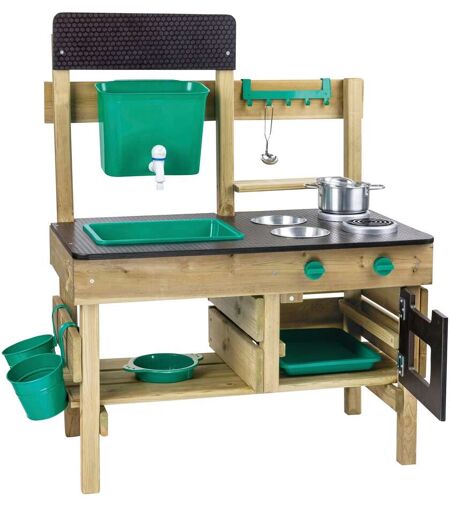 Heute wird draußen gekocht: Die Outdoor Spielküche von Hape bietet den Minis eine optimale Grundlage, um Matsch-Burger und Blätter-Salate zuzubereiten. Outdoor Spielküche von Hape Wasserbehälter, Wasserhahn, Spüle, Herd, Backofen, Backblech, 2 Schüsseln, Topf, Schöpfkelle, Sieb, 2 Blumentöpfe 99(L) x 77(B) x 46(T) cm aus nachhaltig angebautem Holz und Bio-Kunststoff ab 3 Jahren geeignet Die Spielküche von Hape animiert Kinder ab drei Jahren dazu, Zeit im Freien zu verbringen. Die Kids können im Spiel leckere Speisen zubereiten, kochen, abwaschen und vieles mehr. Ein praktischer Tank ermöglicht ihnen fröhliche Wasserspiele. Das Spülbecken, die Kochplatten und der Backofen sorgen für ein authentisches Küchen-Feeling. Auch das umfangreiche Zubehör gestaltet das Spiel kleiner Köche möglichst realistisch. Für eine wohnliche Atmosphäre können die Minis die zum Lieferumfang gehörenden Blumentöpfe bepflanzen und ihre Spielküche dekorieren. Gut zu wissen: Die Spielküche ist aus nachhaltig angebautem Holz und Bio-Kunststoff gefertigt. ...