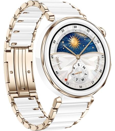Die Watch GT5 PRO 42mm (Jana-B29C) besticht durch elegantes, schlankes Design und eine breite Palette an Funktionen. Diese Smartwatch aus dem Hause Huawei integriert ein 3,35 cm (1,32") großes AMOLED-Farbdisplay in ein nur 9,6 Millimeter dickes Gehäuse aus Keramik. Dabei kann das Ziffernblatt ganz nach den eigenen Vorlieben gestaltet werden. Eine breite Palette an Monitoring-Funktionen macht die Watch GT5 PRO 42mm zu einem vielseitigen Alltagsbegleiter. Darunter finden sich Programme zur Schrittzählung, zur Stressüberwachung, EKG, zum Überwachen der Schlafatmung, Atemübungen und Zyklus-Tracking - für ein gesünderes Leben. Darüber hinaus bietet die Watch GT5 PRO 42mm vielfältige Benachrichtigungsmöglichkeiten. Der Akku hält dabei bis zu sieben Tage durch und das Uhren-Gehäuse ist nach IP69K gegen Wasser geschützt. Diese Version wird mit einem weißen Gehäuse und einem weißen Armband aus Keramik-Titan ausgeliefert. ...