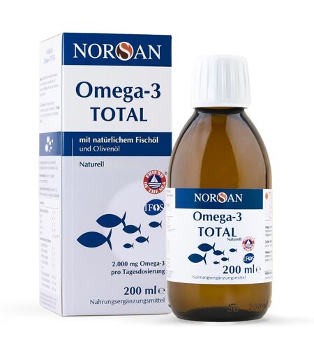 Anwendungsgebiet von Norsan Omega 3 TOTAL Naturell flüssigNorsan Omega 3 TOTAL Naturell flüssig ist eine einzigartige Kombination aus einem natürlichen Fischöl aus Wildfang mit hohem EPA-Gehalt sowie einem kaltgepressten Olivenöl aus kontrolliertem biologischen Anbau mit hohem Gehalt an Polyphenolen. Eine Tagesdosis (8 ml/1 Esslöffel) liefert 2.000 mg Omega-3-Fettsäuren (EPA und DHA).Wirkstoffe / Inhaltsstoffe / ZutatenZutaten von Norsan Omega 3 TOTAL Naturell flüssig: