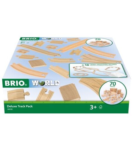 Das 70-teilige Schienensortiment Deluxe sorgt für noch mehr kreativen Spielspaß in der BRIO World. Für zusätzliche Inspiration sorgt der beigelegte Flyer mit verschiedenen Strecken-Optionen.Über BRIO World: BRIO World ist unser offenes Spielsystem, das mit Ihrem Kind mitwächst. Alle Spielzeuge von BRIO World lassen sich miteinander kombinieren, um eine vollständig anpassbare Welt zu erschaffen, die sich hervorragend zum Herausfodern wachsender Köpfe eignet. Es gibt unzählige Kombinationen für fantasievolles Spielen, die darauf warten, entdeckt zu werden – nehmen Sie einfach ein Teil in die Hand und beginnen Sie mit dem Bau Ihrer Welt.das 36030 Deluxe-Schienenpaket enthält 70 Teile: 1x lange gerade Schiene, 4x mittellange gerade Schienen, 10x kurze gerade Schienen, 12x lange Kurven, 11x kurze Kurven, 2x Rampen, 12x Mini-Schienen, 2x Stopps, 5x Stützen, 2x Steigschienen, 5x kleine Weichen, 4x große Weichen. ...