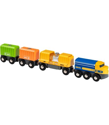 Der extralange Güterzug mit drei Waggons hat gerade den Bahnhof mit sehr viel Ladung verlassen. Dieser knallbunte Spielzeugzug hat drei Güterwaggons – zwei Waggons mit orangefarbenen und hellgrünen Containern und einen speziellen gelben Güterwaggon, hinter dessen Schiebetüren sich ein glänzender, neuer Motor verbirgt. Mit den bekannten BRIO Magnetverbindungen kann dieser Güterzug mit allen anderen BRIO Loks und Waggons verbunden werden. ...