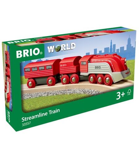 Dieser Highspeed-Dampfzug ist eine tolle Ergänzung für deine BRIO Bahn. Highspeed-Dampfzügen aus aller Welt haben das unverkennbare retro-futuristischen Design in rot und silber inspiriert. Dieser Dampf-Zug wird mit zwei Holzwaggons verlängert, die mit vielen Details und sieben Radpaaren in hoher Geschwindigkeit fahren. Dieser Spielzeugzug ist aus Buchenholz, hochwertigem Kunststoff und Metallteilen hergestellt und fährt auf den bewährten BRIO Holzschienen.33557 Streamline-Zug, bestehend aus 3 Teilen: 1x Streamline-Lokomotive, 2x Holzwagen. ...