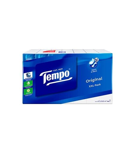 Tempo Taschentücher Original 4-lagig– jetzt im XXL-Pack mit 56x 10 St.Ob Tränen, Erkältung oder kleine Missgeschicke – die nassfesten Tempo Taschentücher bleiben stark und reißen nicht. Selbst wenn sie feucht werden, behalten sie ihre Form und leisten zuverlässig ihren Dienst. Ohne Duftstoffe – sanft & verträglichDie duftstofffreien Taschentücher sind besonders hautfreundlich und ideal für empfindliche Nasen. Sie bieten reine, natürliche Sauberkeit – ganz ohne unnötige Zusätze. Wiederverschließbare Verpackung – immer frisch Dank der praktischen wiederverschließbaren Öffnung bleiben die Tücher hygienisch, sauber und jederzeit frisch. Perfekt für unterwegs, im Auto oder in der Handtasche. Geprägte 4-lagige StärkeDie feine Prägung verleiht den Taschentüchern nicht nur eine edle Optik, sondern sorgt auch für eine angenehme Haptik. Mit vier Lagen Zellstoff bieten sie maximale Reißfestigkeit und gleichzeitig eine samtweiche Berührung. Bestellen Sie jetzt den Pack mit 56x 10 Tempos online, damit Sie einen Vorrat an Taschentüchern im Haus haben. ...