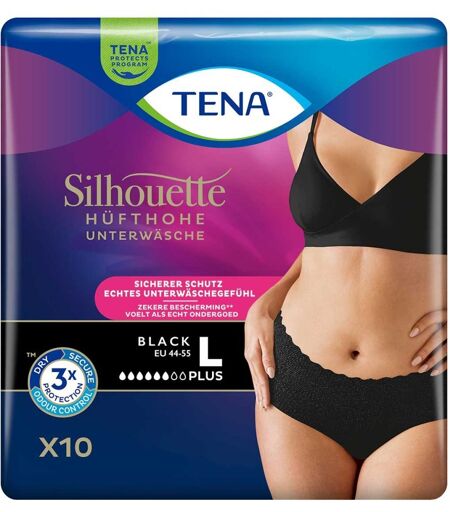 Anwendungsgebiet von Tena Silhouette Plus L Black Inkontinenz PantsDie Tena Silhouette Plus L Black Inkontinenz Pants mit hüfthoher Form bieten zuverlässigen Schutz bei mittlerer bis schwerer Blasenschwäche und sind besonders geeignet für Frauen nach der Geburt.