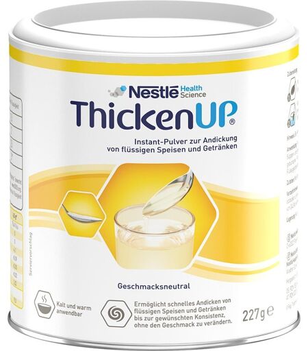 Anwendungsgebiet von Thickenup PulverThickenup Pulver ermöglicht schnelles Andicken von Flüssigkeiten und pürierten Speisen bei Kau- und Schluckstörungen. Zur Unterstützung von Schlucktraining.Wirkstoffe / Inhaltsstoffe / ZutatenZutaten von Thickenup Pulver:Modifizierte Maisstärke.Kann Spuren von Milch enthalten.Nährstoffe:Fett: Der Fettanteil ist mit < 0,15 g sehr gering.Kohlenhydrate: Leicht verträgliche, modifizierte Maisstärke.Eiweiß: Der Eiweißanteil ist mit < 0,5 g / 100 g sehr gering. Ballaststoffe: Der Ballaststoffanteil ist mit < 1,0 g / 100 g gering.GegenanzeigenBei bekannter Überempfindlichkeit gegenüber einen der oben genannten Inhaltsstoffe sollte dieses Produkt nicht angewendet werden.DosierungVerzehrempfehlung von Thickenup Pulver: