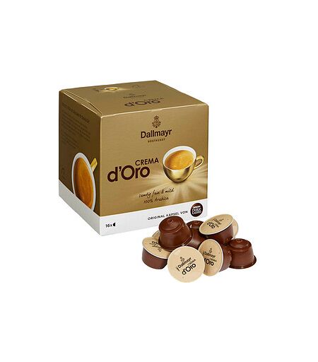 Dallmayr Crema d'Oro Kaffeekapseln: Die perfekte Wahl für besonderen KaffeegenussDie Dallmayr Crema d'Oro Kaffeekapseln, hergestellt aus 100 % Arabicabohnen, bieten Kaffeegenuss auf italienische Art. Das kräftige Aroma verwöhnt Ihren Gaumen und lässt Sie den vollen Geschmack jeder Tasse Kaffee genießen.Kompatibel mit Dolce Gusto KapselmaschinenDie Dallmayr Crema d'Oro Kaffeekapseln wurden speziell für Dolce Gusto Kapselmaschinen entwickelt. Sie passen perfekt und gewährleisten eine schnelle und unkomplizierte Zubereitung Ihres Lieblingskaffees.16 Portionen pro PackungJede Packung enthält 16 Kapseln, sodass Sie immer ausreichend Kaffeevorrat haben. Egal, ob Sie sich selbst verwöhnen oder Gäste bewirten möchten - mit den Dallmayr Crema d'Oro Kaffeekapseln sind Sie bestens ausgestattet.Schnell und unkompliziertDie Kaffeezubereitung war noch nie so einfach. Legen Sie einfach eine Kapsel in Ihre Dolce Gusto Maschine ein uns lassen Sie sich per Knopfdruck vom Aroma der Arabicabohnen verzaubern. Die Dallmayr Crema d'Oro Kaffeekapseln sind hermetisch verschlossen und bewahren so die Frische des Kaffees, damit Sie ihn genießen können, wann immer Sie wollen.Bestellen Sie noch heute das Pack à 16 St. in unserem Online-Shop und lassen Sie sich von der Qualität und dem samtigen Geschmack des gemahlenen Röstkaffees Dallmayr Crema d'Oro überzeugen. ...