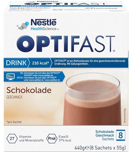 Egal, ob Sie Ihr Gewicht halten oder endlich wieder zu Ihrem Wohlfühl-Body finden möchten: Das umfassende Sortiment der Optifast® Diet Selection kann beides! Es bietet Ihnen bei nur maximal 250 kcal pro Portion eine große Geschmacksvielfalt von lecker-cremig bis herzhaft-würzig. Als vollwertiger Mahlzeitersatz für eine gewichtskontrollierende Ernährung erfüllt die Zusammensetzung hohe rechtliche Anforderungen und ist nicht mit handelsüblichen Proteinprodukten vergleichbar.Wirkungsweise von Optifast home Drink Schokolade PulverOptifast home Drink Schokolade Pulver ersetzt eine komplette Mahlzeit im Rahmen einer kalorienarmen Ernährung. Durch die hochwertige Eiweißzusammensetzung der Optifast home Drink Schokolade Pulver wird der Abbau des Körperfetts effektiv unterstützt, während die Muskelmasse erhalten bleibt. Außerdem wird der Körper hervorragend mit allen erforderlichen Nährstoffen, Vitaminen und Mineralstoffen versorgt, um die Leistungsfähigkeit zu fördern.Wirkstoffe / Inhaltsstoffe / ZutatenZutaten von Optifast home Drink Schokolade Pulver: