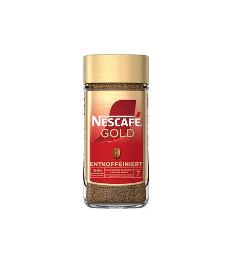 NESCAFÉ Gold Entkoffeiniert – kräftig löslicher Bohnenkaffee für den schnellen GenussDer lösliche NESCAFÉ Gold Entkoffeiniert überzeugt mit seinem kräftig Aroma und eignet sich ideal für die schnelle Zubereitung einer Tasse Kaffee ohne Aufwand.Fein abgestimmter GeschmackDieser lösliche Bohnenkaffee bietet ein ausgewogenes Kaffeearoma, das kräftig und harmonisch wirkt. Es rundet das Geschmackserlebnis ab und sorgt für einen vollmundigen Kaffee, der sich angenehm auf der Zunge entfaltet.Praktisch und vielseitig in der AnwendungMit einer Füllmenge von 200 g lässt sich der Kaffee einfach portionieren und ist ideal für die Zubereitung einzelner Tassen geeignet. Das Produkt ist trocken und vor Wärme geschützt zu lagern, um die Qualität und das Aroma langfristig zu bewahren.Hergestellt in Deutschland mit sorgfältiger Auswahl der ZutatenDer lösliche Bohnenkaffee besteht zu 100% aus löslichen Kaffeebohnen und wird in Deutschland unter hohen Qualitätsstandards verarbeitet. Das garantiert eine gleichbleibende Qualität und ein unverfälschtes Aroma.Genießen Sie die unkomplizierte Zubereitung und den kräftigen Geschmack von NESCAFÉ Gold Entkoffeiniert in Ihrer Tasse. ...
