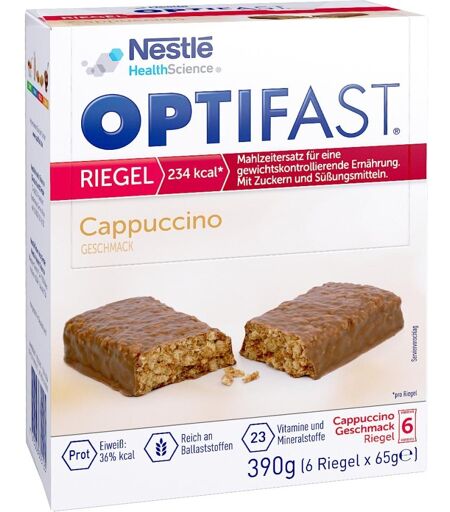 Egal, ob Sie Ihr Gewicht halten oder endlich wieder zu Ihrem Wohlfühl-Body finden möchten: Das umfassende Sortiment der Optifast® Diet Selection kann beides! Es bietet Ihnen bei nur maximal 250 kcal pro Portion eine große Geschmacksvielfalt von lecker-cremig bis herzhaft-würzig. Als vollwertiger Mahlzeitersatz für eine gewichtskontrollierende Ernährung erfüllt die Zusammensetzung hohe rechtliche Anforderungen und ist nicht mit handelsüblichen Proteinprodukten vergleichbar.Wirkungsweise von Optifast Riegel CappuccinoOptifast Riegel Cappuccino ersetzt eine komplette Mahlzeit im Rahmen einer kalorienarmen Ernährung. Durch die hochwertige Eiweißzusammensetzung der Optifast Riegel Cappuccino wird der Abbau des Körperfetts effektiv unterstützt, während die Muskelmasse erhalten bleibt. Außerdem wird der Körper hervorragend mit allen erforderlichen Nährstoffen, Vitaminen und Mineralstoffen versorgt, um die Leistungsfähigkeit zu fördern.Wirkstoffe / Inhaltsstoffe / ZutatenZutaten von Optifast Riegel Cappuccino: