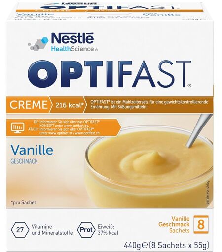 Anwendungsgebiet von Optifast home Creme Vanille PulverOptifast home Creme Vanille Pulver ist ein Mahlzeitenersatz für eine gewichtskontrollierende Ernährung, mit Süßungsmitteln.