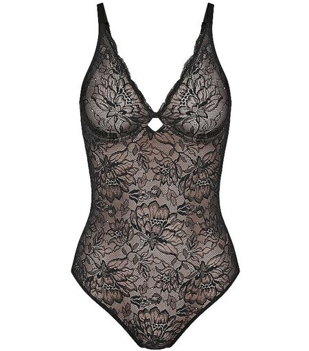 Eleganter Spitzenbody Blumenmuster Träger V-Aussschnitt Druckknopfverschluss Farbbezeichnung: Black Material: 73% Polyamid, 27% Elasthan ...