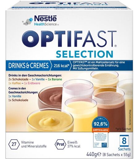 Anwendungsgebiet von Optifast Selection Drinks & CremesOptifast Selection Drinks & Cremes ist ein Mahlzeitenersatz für eine gewichtskontrollierende Ernährung oder Teil einer Tagesration für gewichtskontrollierende Ernährung. Optifast Selection Drinks & Cremes enthält Drinks in 6 verschiedenen und Cremes in 2 verschiedenen Geschmacksrichtungen.