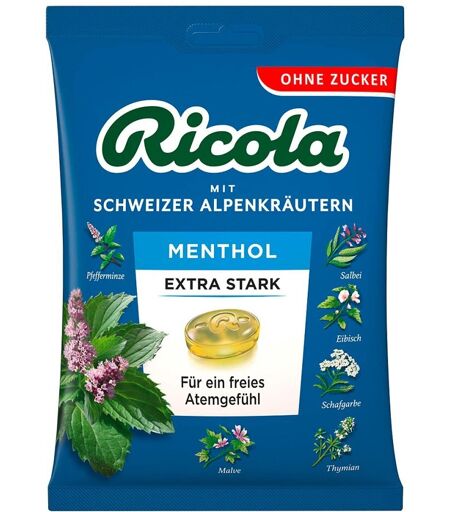 Anwendungsgebiet von Ricola ohne Zucker Beutel Menthol Extra Stark BonbonsDas Hustenbonbon kombiniert extra viel natürliches Menthol der Pfefferminze mit der bewährten Kräutermischung aus 13 Schweizer Alpenkräutern und wertvollem ätherischen Öl – Für das gute Gefühl frei durchzuatmen. Die fein abgestimmte Rezeptur und der ausgewogene Geschmack machen Ricola trotz des hohen Mentholgehalts zu einem angenehm intensiven und wohlschmeckenden Atemerlebnis.