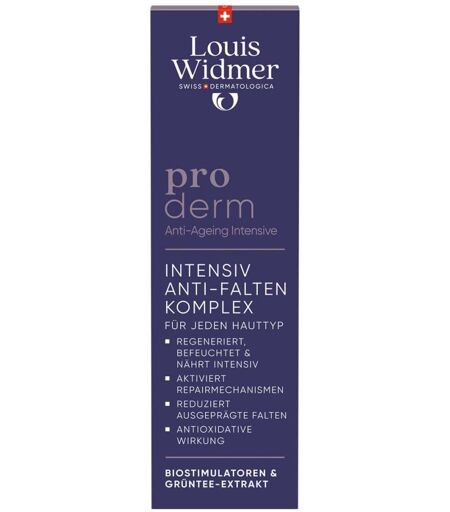 Anwendungsgebiet von Louis Widmer proderm Intensiv Anti-Falten Komplex Louis Widmer proderm Intensiv Anti-Falten Komplex  wurde speziell für die anspruchsvolle und stark beanspruchte Haut entwickelt. Mit ihrer hochwirksamen Formel reduziert sie sichtbar ausgeprägte Falten und sorgt für ein glatteres, jugendlicheres Hautbild.Dank des enthaltenen Grüntee-Extrakts OM24 stimuliert die Creme die natürlichen Reparaturmechanismen der Haut und unterstützt ihre Regeneration. Gleichzeitig schützt sie effektiv vor vorzeitiger Hautalterung und negativen Umwelteinflüssen.Besonders geeignet für empfindliche und beanspruchte Hautpartien wie Gesicht, Hals und Dekolleté, bietet diese Intensivpflege eine tiefenwirksame Feuchtigkeitsversorgung und langanhaltenden Schutz.Für eine straffe, gepflegte und revitalisierte Haut – Tag für Tag.Wirkungsweise von Louis Widmer proderm Intensiv Anti-Falten Komplex 1.    Hochwirksame Intensivpflege mit Langzeitschutz gegen vorzeitige Hautalterung und vor negativen Umwelteinflüssen2.    Stimuliert natürlichen Anti-Ageing Funktionen der Haut3.    Der Biostimulatoren-Komplex ersetzt in der Hornschicht die natürlichen Feuchthaltesubstanzen4.    Jojobaöl, ein hochwertiges pflanzliches Öl, pflegt und schützt die Haut5.    Vitamin C schützt als Radikalfänger das Gewebe und beugt vorzeitiger Hautalterung vor6.    Vitamin E neutralisiert schädliche freie Radikale und stimuliert die hauteigenen Repair-Mechanismen7.    OM24 ist ein Extrakt aus grünem Tee. Es ist ein natürlicher Zellschutz auf der Basis von Catechinen und bewirkt die Aufrechterhaltung und Stimulation der natürlichen Anti-Ageing Funktionen der Haut (hochaktiver Radikalfänger mit unterstützender Wirkung auf die Reparatursysteme in den Hautzellen)Wirkstoffe / Inhaltsstoffe / ZutatenLouis Widmer proderm Intensiv Anti-Falten Komplex  enthält: