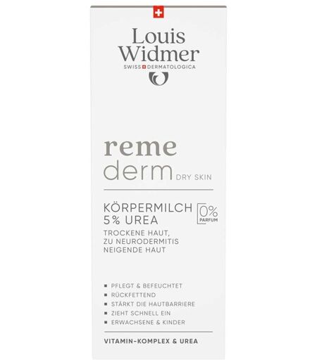 Anwendungsgebiet von Louis Widmer remederm Körpermilch 5% Urea unparfümiertDie Louis Widmer remederm Körpermilch 5% Urea unparfümiert ist die ideale Lösung für Menschen mit trockener bis sehr trockener Haut sowie bei Neurodermitis. Speziell entwickelt für die Bedürfnisse sensibler, gereizter und geröteter Haut, spendet diese hochwertige Körperpflege intensive Feuchtigkeit und beruhigt gleichzeitig irritierte Hautstellen.Wirkungsweise von Louis Widmer remederm Körpermilch 5% Urea unparfümiertDie Louis Widmer remederm Körpermilch 5% Urea unparfümiert bietet intensive Feuchtigkeit und Schutz für trockene, gereizte und zu Neurodermitis neigende Haut. Urea und Biostimulatoren versorgen die Haut tiefenwirksam mit Feuchtigkeit, machen sie weich und elastisch.Panthenol beruhigt irritierte Haut, lindert Juckreiz und fördert die Regeneration. Jojobaöl schützt die Hautbarriere, während Vitamin E freie Radikale neutralisiert.Dank der schnell einziehenden Textur bleibt die Haut angenehm gepflegt – ohne zu fetten. Ideal für die tägliche Pflege bei empfindlicher Haut – auch für Kinder geeignet.Wirkstoffe / Inhaltsstoffe / ZutatenLouis Widmer remederm Körpermilch 5% Urea unparfümiert enthält:Phenoxyethanol, Ethylhexylglycerin. Hydroxyethylcellulose, Xanthan Gum, Citric Acid, Disodium EDTA, Pantolactone, Propylene Glycol, Triacetin, Sorbitan Olivate, Acrylates/C10-30 Alkyl Acrylate Crosspolymer, Amino Acids, Tocopherol, Cetyl Alcohol, Cetearyl Olivate, Potassium Cetyl Phosphate, Panthenol, Boron Nitride, Tocopheryl Acetate, Sodium Lactate, Arginine, Sorbitol, Collagen Glycol, Cetearyl Isononanoate, Dimethicone, Simmondsia Chinensis (Jojoba) Seed Oil, Aqua, Urea, Caprylic/Capric Triglyceride, Decyl Oleate, Ethylhexyl Stearate, Glycerin, Butylene