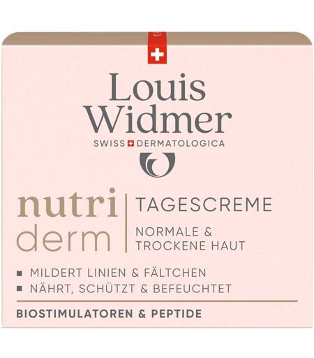 Anwendungsgebiet von Louis Widmer nutriderm Tagescreme Louis Widmer nutriderm Tagescreme ist eine nährende, straffende Tagescreme mit Hyaluronsäure für ein gepflegtes Hautbild.Wirkungsweise von Louis Widmer nutriderm Tagescreme 1. Die Tagescreme pflegt und schützt die trockene Haut2. Spendet intensive Feuchtigkeit, bietet einen Langzeitschutz gegen vorzeitige Hautalterung und schützt vor negativen Umwelteinflüssen3. Der Biostimulatoren-Komplex und Hyaluronsäure erhöhen das Wasserbindevermögen der Haut4. Matrixyl® 3000 reduziert Linien und Fältchen durch Stimulation der Collagensynthese und spendet Feuchtigkeit5. Shea Butter wirkt rückfettend, hautglättend und schützt die Haut vor schädlichen Umwelteinflüssen6. Creatin, ein körpereigener Bestandteil (Aminosäurederivat), fördert die Hauterneuerung7. Panthenol beruhigt irritierte Haut8. Vitamin E schützt vor freien Radikalen und stimuliert den hauteigenen Repair-MechanismusWirkstoffe / Inhaltsstoffe / ZutatenLouis Widmer nutriderm Tagescreme enthält: