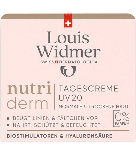 Anwendungsgebiet von Louis Widmer nutriderm Tagescreme UV 20 unparfümiertDie Louis Widmer nutriderm Tagescreme UV 20 unparfümiert vereint hochwirksame Anti-Aging-Pflege mit umfassendem Schutz – ideal für empfindliche Haut, die besonderen Wert auf Duftstofffreiheit legt.Die Formel enthält wertvolle Anti-Aging-Wirkstoffe, die gezielt den Zeichen der Hautalterung entgegenwirken. UVA- und UVB-Filter schützen die Gesichtshaut zuverlässig vor schädlicher UV-Strahlung und beugen so lichtbedingter Hautalterung wirksam vor.Wirkungsweise von Louis Widmer nutriderm Tagescreme UV 20 unparfümiertIm Inneren der Haut entfaltet der Biostimulatoren-Komplex seine Wirkung: Er dringt in tiefere Hautschichten vor und ersetzt jene Substanzen, die mit zunehmendem Alter verloren gehen – für mehr Spannkraft und Vitalität.Hyaluronsäure erhöht das Wasserbindevermögen der Haut, spendet intensiv Feuchtigkeit und verlangsamt somit den Alterungsprozess sichtbar. Ergänzt wird dies durch Shea Butter, die rückfettend, glättend und schützend gegenüber äußeren Umwelteinflüssen wirkt.Creatin, ein natürlicher Energieträger, unterstützt die Hauterneuerung und fördert den zellulären Stoffwechsel, während Panthenol irritierte Haut beruhigt und deren Fähigkeit zur Feuchtigkeitsspeicherung stärkt.Vitamin E bietet effektiven Schutz vor freien Radikalen und trägt zur Regeneration der Hautbarriere sowie zur Stimulation hauteigener Reparaturprozesse bei.Abgerundet wird die Wirkung durch eine sichtbare Verbesserung des Hautbildes: Die Haut erscheint geglättet, gestärkt und gewinnt an Elastizität. Das verbesserte Wasserbindevermögen der Hornschicht trägt zusätzlich zu einer strahlenden, gepflegten Ausstrahlung bei.Wirkstoffe / Inhaltsstoffe / ZutatenLouis Widmer nutriderm Tagescreme UV 20 unparfümiert enthält: