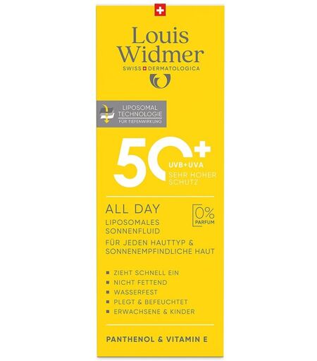 Anwendungsgebiet von Louis Widmer All Day 50+ unparfümiertLouis Widmer All Day 50+ unparfümiert ist eine besonders hautverträgliche, liposomale Sonnenmilch, die speziell für extrem sonnenempfindliche Haut entwickelt wurde – eignet sich aber ebenso für alle Hauttypen. Dank der parfumfreien Formulierung ist sie ideal für Menschen mit sensibler oder allergieanfälliger Haut. Die wasserfeste Textur lässt sich angenehm auftragen, zieht schnell ein und sorgt für ein geschmeidiges Hautgefühl – optimal für den täglichen Gebrauch bei hoher Sonneneinstrahlung.Wirkungsweise von Louis Widmer All Day 50+ unparfümiertDie fortschrittliche Formulierung von Louis Widmer All Day 50+ unparfümiert kombiniert hohen Sonnenschutz mit intensiver Pflege und Hautregeneration.Photostabile UVA-/UVB- und Breitbandfilter bieten einen sehr hohen Schutz vor schädlicher UV-Strahlung. Die liposomale Technologie sorgt für eine gleichmäßige Verteilung der Filter und verbessert die Aufnahme in die Haut.Vitamin E wirkt antioxidativ, schützt vor freien Radikalen und mildert UV-bedingte Hautschäden. Zugleich stärkt es die Hautbarriere, glättet das Hautbild und verbessert das Wasserbindevermögen der Hornschicht.Panthenol beruhigt gereizte Haut, wirkt normalisierend und unterstützt nachhaltig das Feuchthaltevermögen.Die schnell einziehende, nicht fettende Formel hinterlässt ein angenehm weiches, gepflegtes Hautgefühl und unterstützt die hauteigene Regeneration – ganz ohne Duftstoffe.Wirkstoffe / Inhaltsstoffe / ZutatenLouis Widmer All Day 50+ unparfümiert enthält: