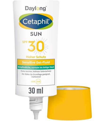 CETAPHIL Sund Daylong™ SPF 30 Sensitive Gel-Fluid Gesicht CETAPHIL Sun Daylong Sensitive Gel-Fluid Gesicht SPF 30 – hochwirksame Sonnencreme für das Gesicht. Fettet nicht & zieht schnell ein. Gleich testen! CETAPHIL Sun Daylong SPF 30 Sensitive Gel-Fluid bietet Sonnenschutz speziell für empfindliche, zu Sonnenallergie neigende und fettige Haut. Dank der extra leichten, fettfreien Formulierung der Sonnencreme, ist sie sowohl als Make-Up-Grundlage sowie für behaarte Gesichtshaut hervorragend geeignet. Das Sonnen-Gel wirkt mattierend und schützt zuverlässig vor sonnenbedingter Hautalterung1. Frei von Parfüm und Emulgatoren. Sonnencreme für empfindliche Gesichtshaut: Vorteile des Gel-Fluids Extra leichte, fettfreie Formulierung Speziell für empfindliche und fettige Haut Als Make-Up-Grundlage geeignet Mattierender Effekt Nicht komedogen Auch für behaarte Gesichtshaut geeignet Schutz vor sonnenbedingter Hautalterung Frei von Parfüm und Emulgatoren Für wen ist das CETAPHIL Sun Daylong™ SPF 30 Sensitive Gel-Fluid geeignet Das CETAPHIL Sun Daylong SPF 30 Sensitive Gel-Fluid ist speziell für empfindliche bis fettige und zu Sonnenallergie oder Mallorca-Akne neigende Haut geeignet. Die extra-leichte Formulierung macht es hervorragend geeignet als Make-Up-Grundlage sowie für die Anwendung auf behaarter Gesichtshaut. Wenn Sie einen zuverlässigen und gleichzeitig leichten Sonnenschutz für das Gesicht suchen, ist das CETAPHIL Sun Daylong SPF 30 Sensitive Gel-Fluid die richtige Wahl. Wirksame Sonnencreme mit Lichtschutzfaktor 30: So schützt CETAPHIL Sun Daylong™ Sensitive Gel-Fluid vor schädlicher Sonnenstrahlung Das Sensitive Gel-Fluid schützt Ihre Haut mit Lichtschutzfaktor 30. Photostabile UV-Filter der Sonnencreme bieten sofortigen und langanhaltenden UVA- und UVB-Schutz, effektiven Zellschutz* und beugen sonnenbedingter Hautalterung vor1. UVA-Schutz: UVA-Strahlung lässt die Haut altern und verursacht Falten und Altersflecken. Sie ist außerdem verantwortlich für allergische Lichtreaktionen wie Mallorca-Akne. Zudem trägt UVA-Strahlung zur Entstehung von Hautkrebs bei. Schutz vor UVB-Strahlung: UVB-Strahlen verursachen Sonnenbrand und können das Erbgut in den Hautzellen schädigen. Im Laufe des Lebens, kann das zur Entstehung von Hautkrebs beitragen. Schutz vor den Folgen der Infrarot-A-Strahlung (IR-A)*: IR-A-Strahlung gilt ebenfalls als Verursacher vorzeitiger Hautalterung. Hinweise zur Produktanwendung Ca. 20 Minuten vor dem Sonnen CETAPHIL Sun Daylong SPF 30 Sensitive Gel-Fluid großzügig auftragen und gut einziehen lassen, um die optimale Wasserresistenz zu erreichen. Im Tagesverlauf mehrfach nachcremen, um den Sonnenschutz aufrechtzuerhalten. Geringe Auftragsmengen reduzieren die Schutzleistung erheblich. Meiden Sie zudem intensive Mittagssonne. Sonnenbrände sind gefährlicher als man denkt Der potentielle gesundheitliche Schaden, den ein Sonnenbrand mit sich bringen kann, ist nicht abgewendet, sobald der Sonnenbrand wieder abgeheilt ist:... ...
