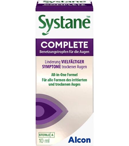 Anwendungsgebiet von Systane COMPLETESystane COMPLETE bieten für trockene und gereizte Augen eine All-in-One Lösung: Lipidtropfen in Nanogröße sind eingebettet in ein viskoelastisches HighTech-Netzwerk aus HP-Guar. Die winzigen Lipidtropfen benetzen die Augen, sie beruhigen, befeuchten und bauen den Tränenfilm wieder auf, für eine spürbare Linderung der Symptome trockener Augen. Die Augentropfen sind empfohlen für alle Formen des Trockenen Auges, inkl. Mischformen und bei Symptomen ungeklärten Ursprungs. Auch wenn die Augen brennen, können Systane COMPLETE eingesetzt werden.