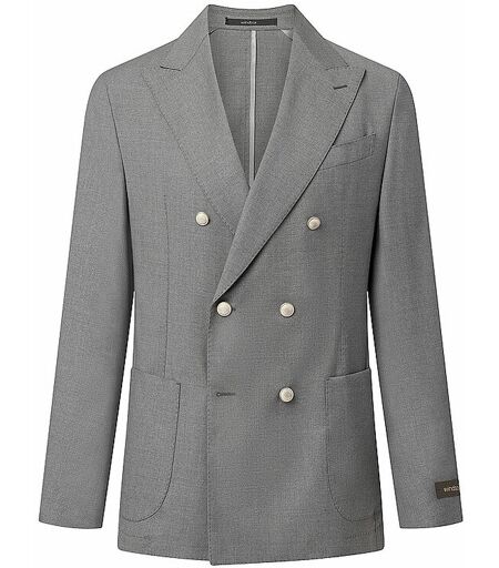 Herren Sakko mit doppelter Knopfleiste Steigendes Revers Lange Ärmel Ärmelabschlüsse mit 4 Kissing-Buttons Eine Brustleistentasche mit Einstecktuch 2 aufgesetzte Taschen 2 Innentaschen AMF-Stitchings und formgebende Nähte 2 Bewegungsschlitze Unifarben Gerade Passform Farbbezeichnung: Medium Grey Material: 100% Schurwolle Futter: 100% Cupro ...