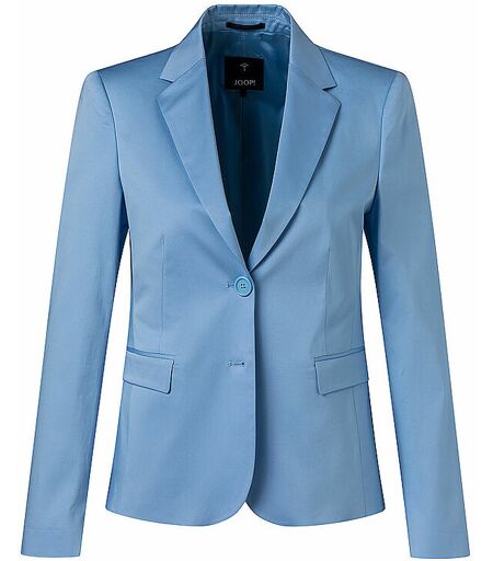 Damen Blazer aus Baumwoll-Stretch Reverskragen Schließt mit zwei Knöpfen Langarm Eingrifftaschen mit Patte Bewegungsschlitz in der hinteren Mitte Schmale Passform Unifarben Farbbezeichnung: Hellblau Passend zur Hose: 7694412 Material: 97% Baumwolle, 3% Elasthan ...