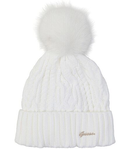Damen Mütze mit Bommel aus Kunstfell Breiter Umschlag mit Logo-Detail Strickmuster Unifarben Farbbezeichnung: Cream White Material: 100% Acryl ...