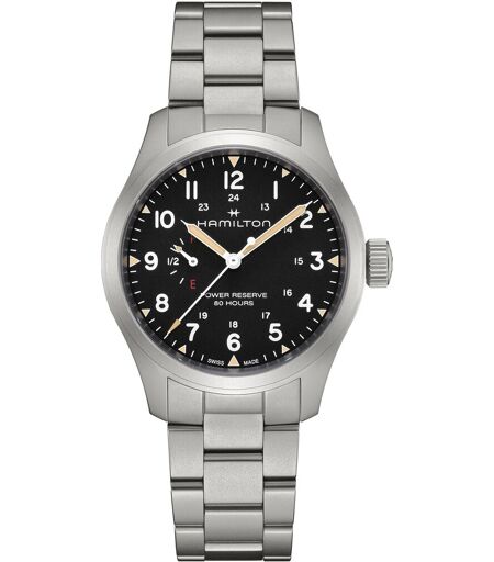 Diese Hamilton Uhr aus der renommierten Khaki Field Kollektion steht für Zuverlässigkeit und Innovation. Das neu entwickelte ETA-Kaliber H-23 ermöglicht erstmals die direkte Ablesung der beeindruckenden Gangreserve von bis zu 80 Stunden – ein Highlight, das durch die „F“ (full) und „E“ (empty) Markierungen auf dem klar gestalteten Zifferblatt besonders betont wird. Das robuste Edelstahlgehäuse und das kratzfeste Saphirglas garantieren Langlebigkeit im Alltag, während moderne Features wie die Nivachron-Technologie magnetische Einflüsse minimieren. Mit einer Wasserdichtigkeit von bis zu 100 Metern begleitet Dich diese Uhr zuverlässig bei allen Abenteuern – vom Büro bis ins Freie. Lass Dich von der perfekten Symbiose aus traditionellem Design und innovativer Technik begeistern – die Hamilton Khaki Field Mechanical Power Reserve ist Dein verlässlicher Begleiter für jeden Tag. Kaliber: Exklusives Handaufzugswerk H-23 Gangreserve: 80 Stunden mit direkter Anzeige auf dem Zifferblatt Gehäusedurchmesser: 40 mm Gehäusematerial: Edelstahl Zifferblattfarbe: Schwarz, mit „Power Reserve 80 Hours“-Anzeige Uhrenglas: Kratzfestes Saphirglas mit Antireflexbeschichtung Anstoßbreite: 20 mm Edelstahlarmband Wasserdichtigkeit: Bis zu 10 bar (100 m) Spezialfunktionen: Nivachron-Technologie für erhöhte Magnetfeldresistenz, Super-LumiNova für optimale Ablesbarkeit im Dunkeln ...